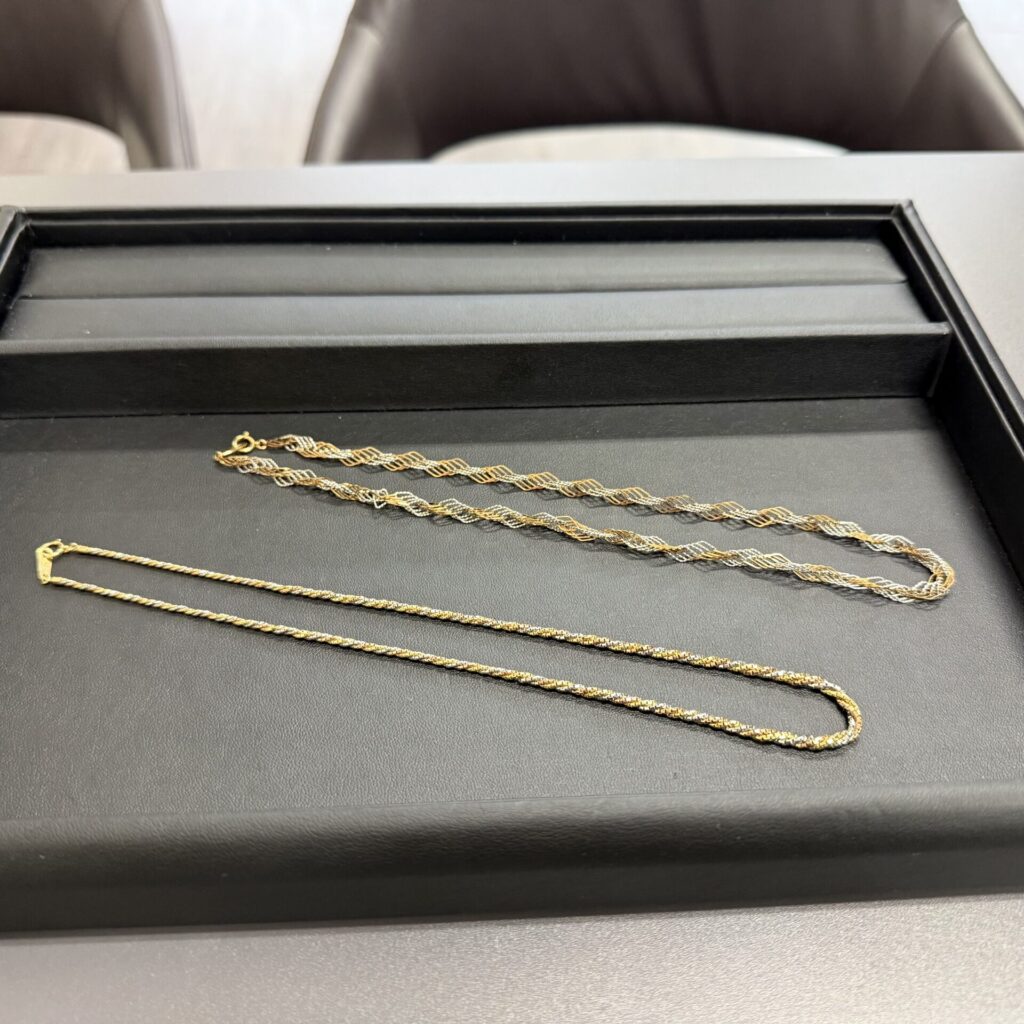 この度お買取させて頂いたお品物になります。 :K18/PT850 コンビ :ネックレス :刻印あり ご家族様から数年前にいただき、直したまま忘れていたみたいで、ご子息様が就職を機にお家の片付けをしていた際に出てきたお品物だそうです。 ご自身でつけることはなく、ご子息様の引越し代に当てたいとのことで、大喜びしてお売りいただきました(笑) 福岡市、春日市、大野城市、太宰府市など福岡県でご売却をご検討中のお客様! 一度、買取礼善へお越しください! ご査定だけでも大丈夫です!!
