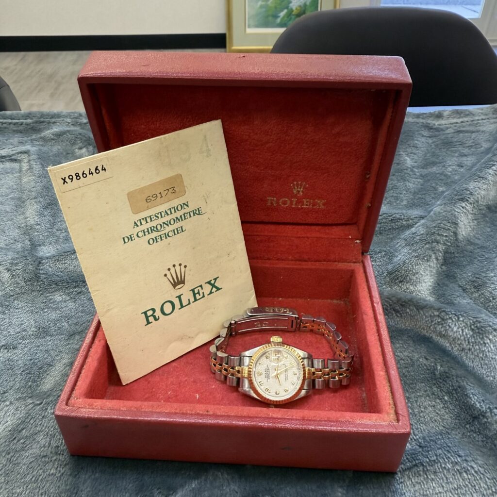 この度お買取させて頂いたお品物になります。 :ロレックス デイトジャスト :69173 :箱、ギャランティー :不動 20年ほど前にご購入後、ずっとご使用になられていたみたいですが、止まってしまいお仕事柄つける機会も減ってしまったとお持ち込みされ、購入時よりもお高くなったことに衝撃を受けていらっしゃいました。(笑) 福岡市、春日市、大野城市、太宰府市など福岡県でご売却をご検討中のお客様! 一度、買取礼善へお越しください! ご査定だけでも大丈夫です!!